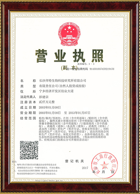 我公司被評為中國獸藥制劑30強企業(yè),并擔任中國口蹄疫學(xué)會(huì )常務(wù)理事會(huì )單位、湖南省動(dòng)保協(xié)會(huì )副理事長(cháng)單位、湖南省養豬協(xié)會(huì )副會(huì )長(cháng)單位等職務(wù).同時(shí)還被授予高新技術(shù)企業(yè)(編號為GR201243000183)、湖南省質(zhì)量信用等級A級企業(yè)、長(cháng)沙市企業(yè)技術(shù)中心。